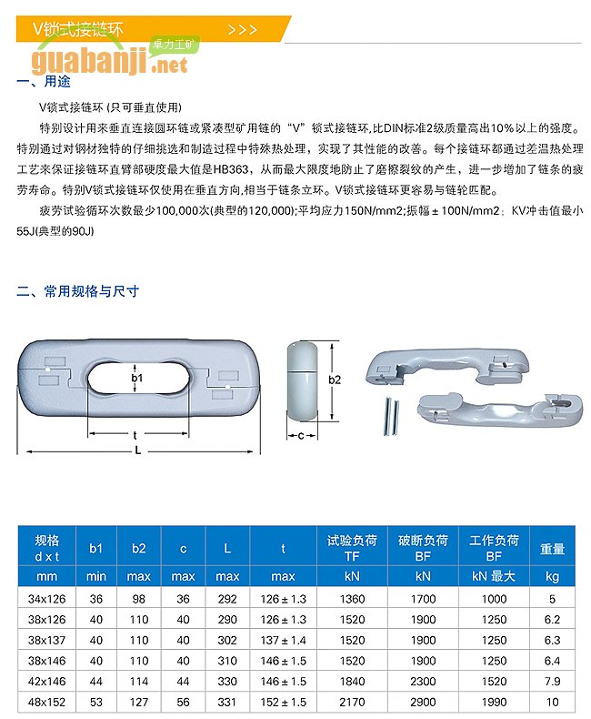特別設(shè)計用來垂直鏈接圓環(huán)鏈或緊湊型礦用鏈的v鎖式接鏈環(huán),比DIN標(biāo)準(zhǔn)2級質(zhì)量高出10%以上的強(qiáng)度。